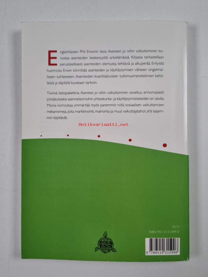 Muu(t) tekijä(t): Marja AhokasMerkinnät: omistajamerkintäAlkuteos: Attitudes and persuasionAsiasanat: käyttäytyminen, asenteet, viestintä, vaikuttaminen, teoriat, tutkimusmenetelmät, mittaus, sosiaalipsykologia, menetelmät, toimintamallit, käyttäytymismallit, asennemuutos, uskottavuus, suostuttelu