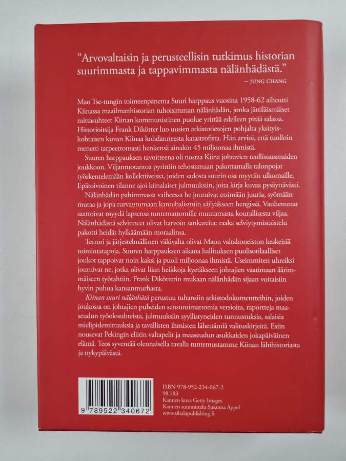 Muu(t) tekijä(t): Seppo HyrkäsAlkuteos: Mao's great famine : the history of China's most devastating catastrophe, 1958-62Asiasanat: historia, sosiaalihistoria, maatalous, poliittiset järjestelmät, kommunismi, joukkotuho, yhteiskuntaolot, talousjärjestelmät, teollistuminen, katastrofit, poliittinen väkivalta, totalitarismi, väestöhistoria, nälänhätä, socialhistoria, samhällsförhållanden, politiska system, befolkningshistoria, lantbruk, kollektivisointi, industrialisering, kommunism, politiskt våld, ekonomiska system, hungersnöd, totalitarism, katastrofer, massförstörelse, kollektivisering
