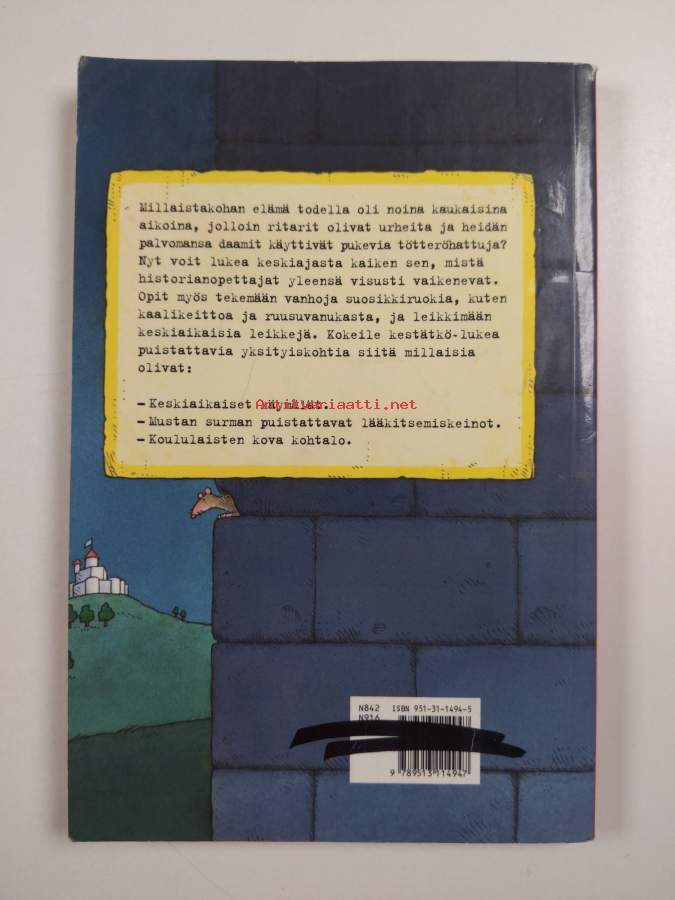 Muu(t) tekijä(t): Erkki Kukkonen, Martin Brown ym.Merkinnät: omistajamerkintä (leima)Sarja: Karmea totuus -sarjaAlkuteos: Horrible histories : the measly Middle AgesAsiasanat: historia, sodat, ruokakulttuuri, lääketiede, keskiaika, lapsen asema, taikausko, normannit, ritarit, läänityslaitos, feodalismi, kirkko (instituutio)