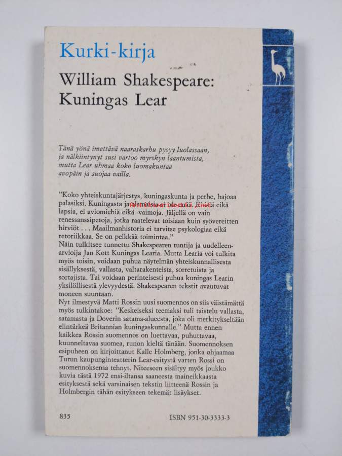 Muu(t) tekijä(t): Matti Rossi, Kalle HolmbergMerkinnät: omistajamerkintäSarja: KurkikirjaAlkuteos: King Lear