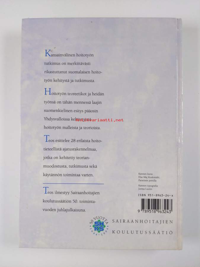 Muu(t) tekijä(t): Raija Viitanen, Ann Marriner-TomeyMerkinnät: omistajamerkintäAlkuteos: Nursing theorists and their workAsiasanat: filosofia, hoitotyö, teoriat, mallit