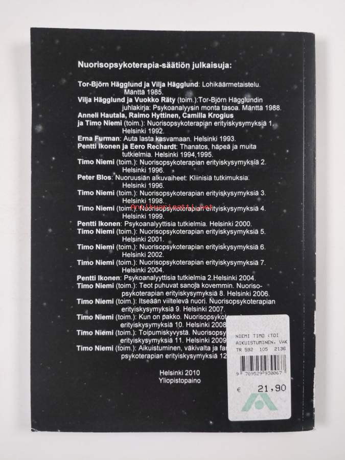 Sarja: Nuorisopsykoterapian erityiskysymyksiä 12; Nuorisopsykoterapia-säätiön julkaisuja; Nuorisopsykoterapia-säätiön julkaisuja [19Asiasanat: persoonallisuuden kehitys, psyykkinen kehitys, nuoret, kriisit, fantasia, aikuistuminen, mielikuvitus, mielenterveyshäiriöt, psykoterapia, traumat, väkivalta, aggressiot, psykiatrinen hoito, nuoruus, perheväkivalta, psykoanalyysi, psyykkiset vaikutukset, nuorisopsykiatria, adolescent psychiatry, sosiaaliset instituutiot