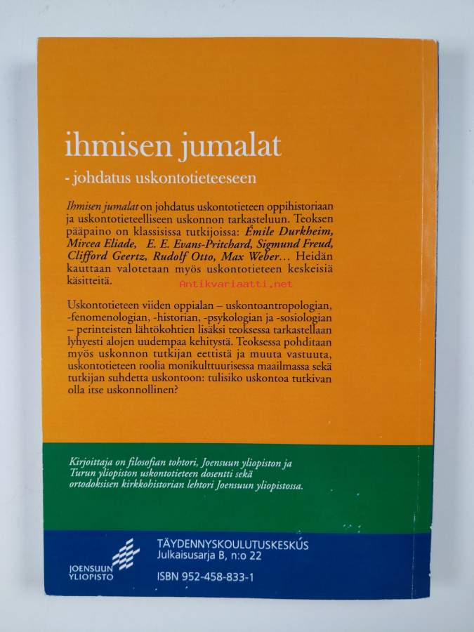 Sarja: Joensuun yliopiston täydennyskoulutuskeskuksen julkaisuja. Sarja B, Oppimateriaalia N:o 22Asiasanat: oppihistoria, jumalakäsitykset, käsitteet, uskontofenomenologia, kognitiivinen uskontotiede, uskontososiologia, uskontoantropologia, uskontotiede, uskonto ja uskonnot