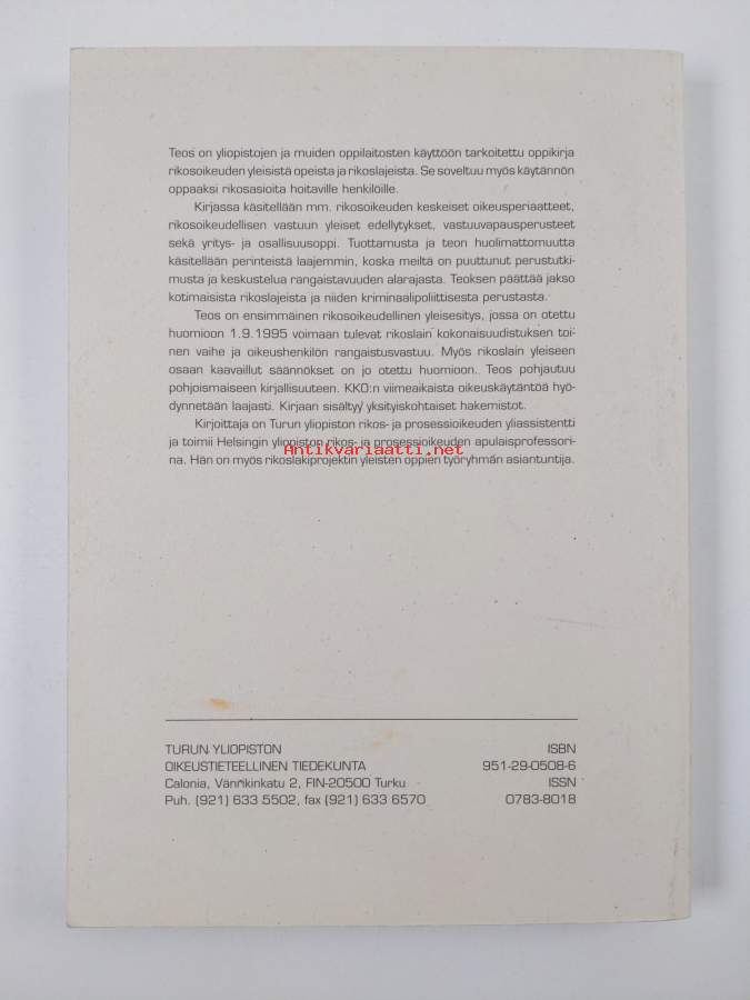 Merkinnät: omistajamerkintä (leima)Sarja: Turun yliopiston oikeustieteellisen tiedekunnan julkaisuja Rikos- ja prosessioikeuden sarja A 21Asiasanat: rikokset, rikosoikeus, rangaistukset, kriminaalipolitiikka