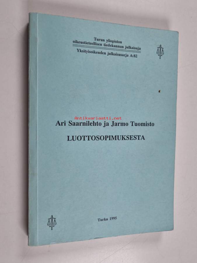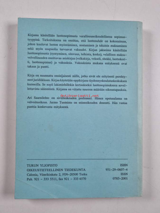 Muu(t) tekijä(t): Jarmo TuomistoMerkinnät: omistajamerkintä (leima)Sarja: Turun yliopiston oikeustieteellisen tiedekunnan julkaisuja. Yksityisoikeuden julkaisusarja. A 82Asiasanat: velat, takaus, vekselit, pantit, velkakirjat, sopimus, vakuus, sekit, luottokortit