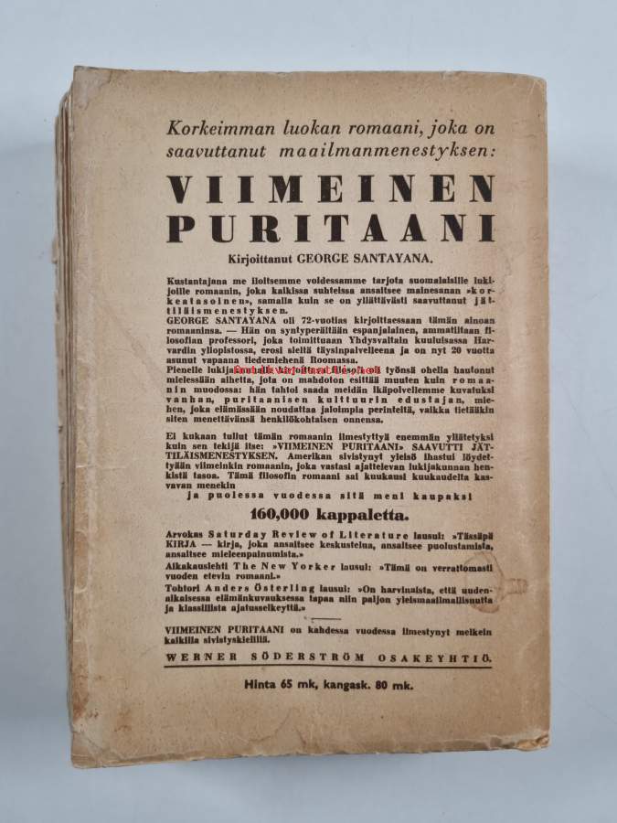 Tyydyttävä. Pientä kulumaa, hieman repeämää kansissa, selkämyksessä vinoutta, selkämyksessä lukutaittumaa, joidenkin sivujen kulmia taitettu