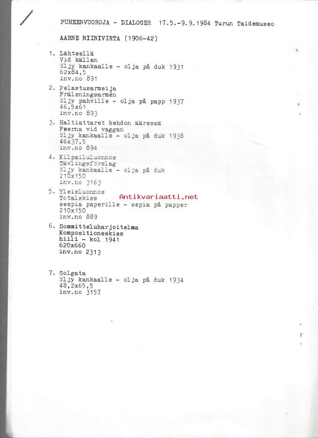 Puheenvuoroja luettelo moniste 1984 Turun Taidemuseo Aarne Niinivirta, Harry Henstiksson, Kalle Eskola, Viljo Mäkinen, Kauko Lehtinen, Alpo Jaakla