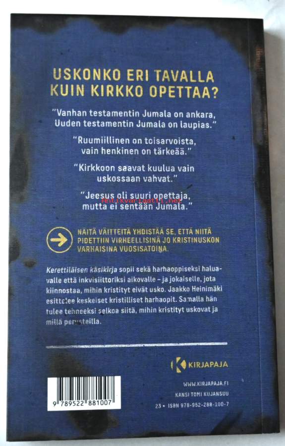 Uskonnollisessa keskustelussa heitetään toisinaan harhaoppisyytöksiä. Usein kuulee myös väitteitä, että kristinusko on vääristynyt alkuperäisestä muodostaan. Tässä kirjassa Jaakko Heinimäki selvittää, millaisia ajatuksia kristinuskon sisällä on vuosisatojen varrella esiintynyt, ja miten on ratkottu, mikä kuuluu oikeaan oppiin, mikä väärään. Miten uskontunnustukset ovat syntyneet ja mitä niistä nykyään pitäisi ajatella? Miten harhaopeille ja harhaoppisille kävi, ja mitä vanhoille harhaopeille nykyään kuuluu? Millaisia teologeja olivat Areios, Nestorios ja Pelagius, joiden nimeä vanhat harhaopit kantavat? Kerettiläisen käsikirja esittelee keskeiset kristilliset heresiat.