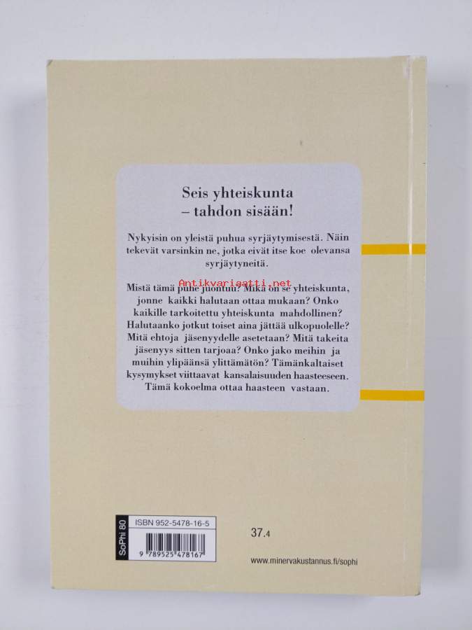 Muu(t) tekijä(t): Sakari Hänninen, Tuula Helne ym.Sarja: SoPhi 80Asiasanat: historia, ennaltaehkäisy, hyvinvointivaltio, yhteiskuntapolitiikka, verkostot, hyvinvointi, yhteisöllisyys, kansalaisuus, maahanmuuttajat, monikulttuurisuus, köyhyys, sosiaaliturva, solidaarisuus, setlementtiliike, sosiaalipolitiikka, syrjäytyminen, yhteiskuntavastuu, sukupolvet, perusturva, yhteisvastuu, sosiaaliset verkostot, perustulo