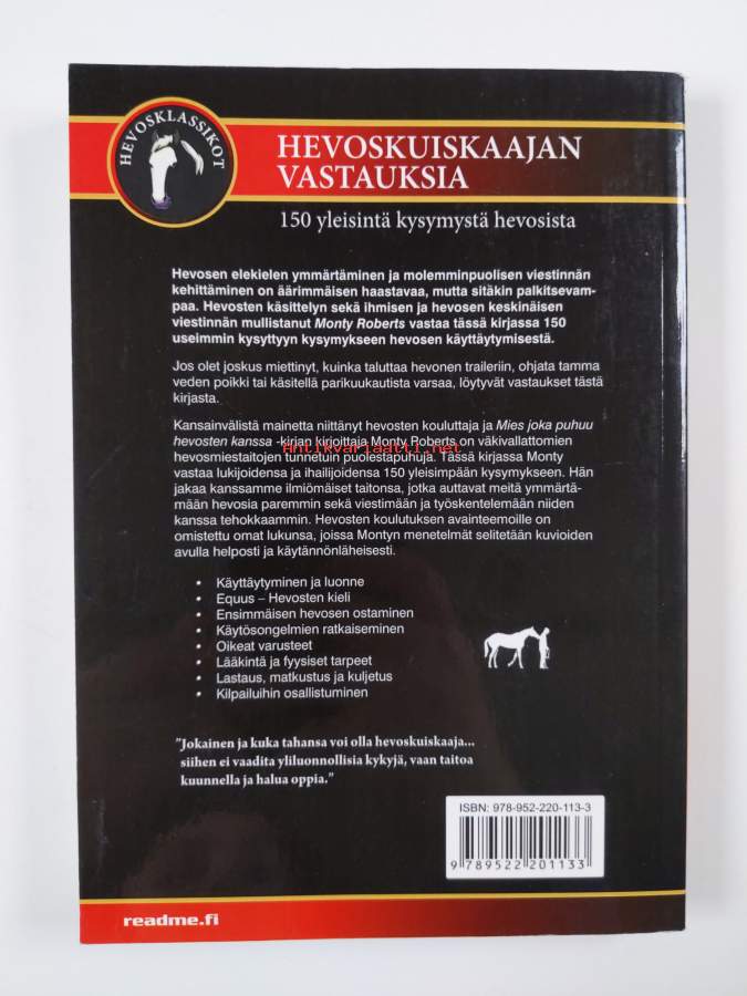 Muu(t) tekijä(t): Sini BonkeSarja: HevosklassikotAlkuteos: Ask Monty : the 150 most common horse problems solvedAsiasanat: hevonen, hevosenhoito, eläinten käyttäytyminen, eläinten koulutus