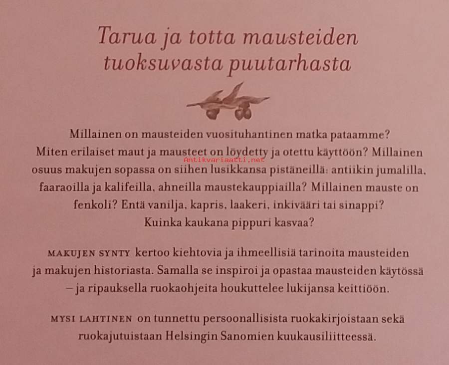 teos kertoo mausteiden historiasta, käytöstä ja kulttuurisesta merkityksestä – yhdistellen tarua ja totta tuoksuvasta puutarhasta. Kuvitettu. Dimensiot 17 ¤ 17 cm.