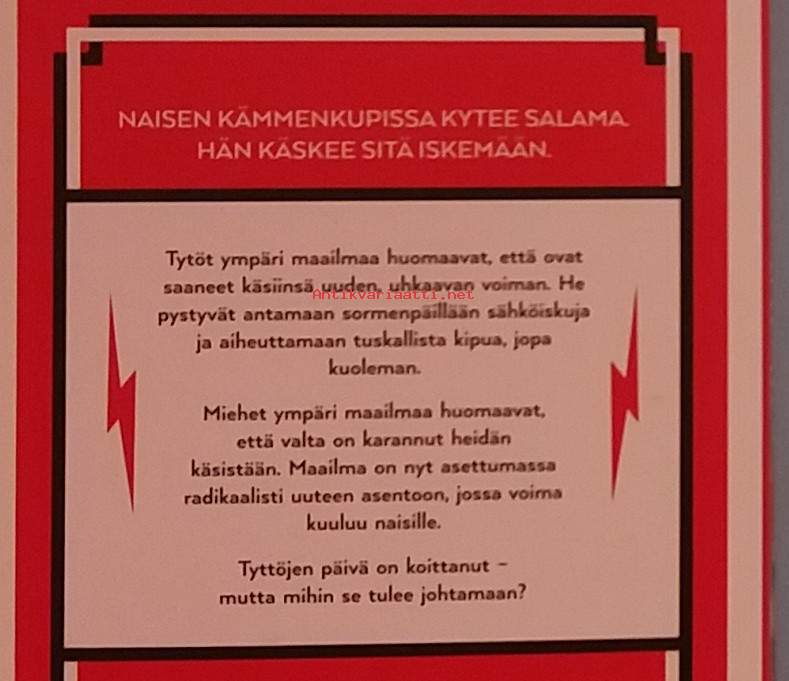 Dystopinen romaani - Tytöt ympäri maailmaa huomaavat, että ovat saaneet käsiinsä uuden kuolettavan voiman. He pystyvät antamaan sormenpäillään sähköiskuja ja aiheuttamaan tuskallista kipua, jopa kuoleman. Tämä muuttaa sukupuolten välisen vallan dynamiikan radikaalisti. Dimensiot 18 ¤ 11 cm.