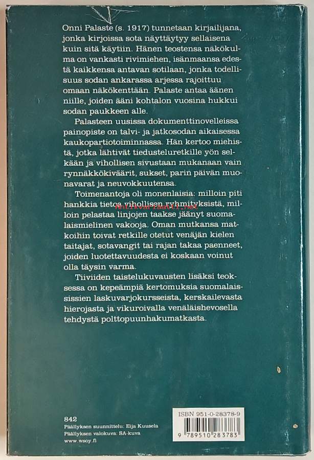 Dokumenttinovellissa on painopiste talvi ja jatkosodan kaukopartiotoiminnassa. Hän kertoo miehistä, jotka lähtivät tiedusteluretkille yön selkään - vihollisen sivustaan vain sukset ja rynnäkkökivääri mukanaan.Kuvitettu.Dimensiot: 21x14cm