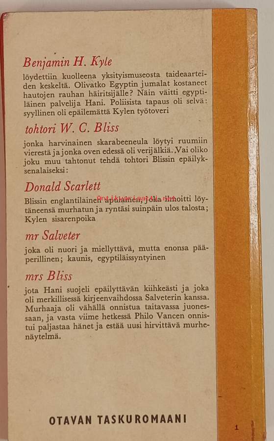 Nerokas rikosten tutkija Philo Vance ratkaisee salaperäisen ja taitavasti toteutetun murhan.Dimensiot: 19x11cm