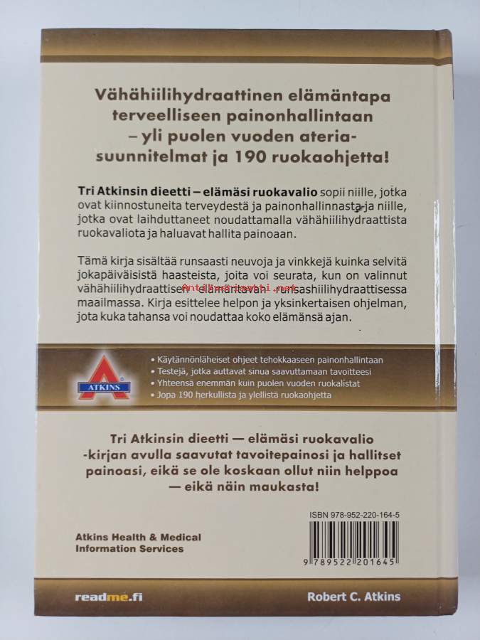 Muu(t) tekijä(t): Katriina LuotonenMerkinnät: ylivedetty omistajamerkintäAlkuteos: Atkins for lifeAsiasanat: ruokaohjeet, keittokirjat, ruokavaliot, erikoisruokavaliot, laihdutus, Atkinsin dieetti, painonhallinta, vähähiilihydraattinen ruokavalio, hiilihydraatit