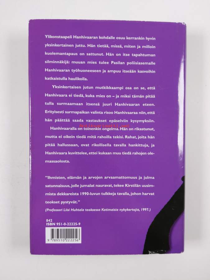 Hyvä. Tarkempi kuntoluokka: K3+ ; Aivan pienoista kolhua kulmissa, pienoista kulumaa kansissa, selkämyksessä aavistus vinoutta, selkämyksessä yksi aivan kevyt lukutaite. Kansipaperin kunto: pientä kulumaa