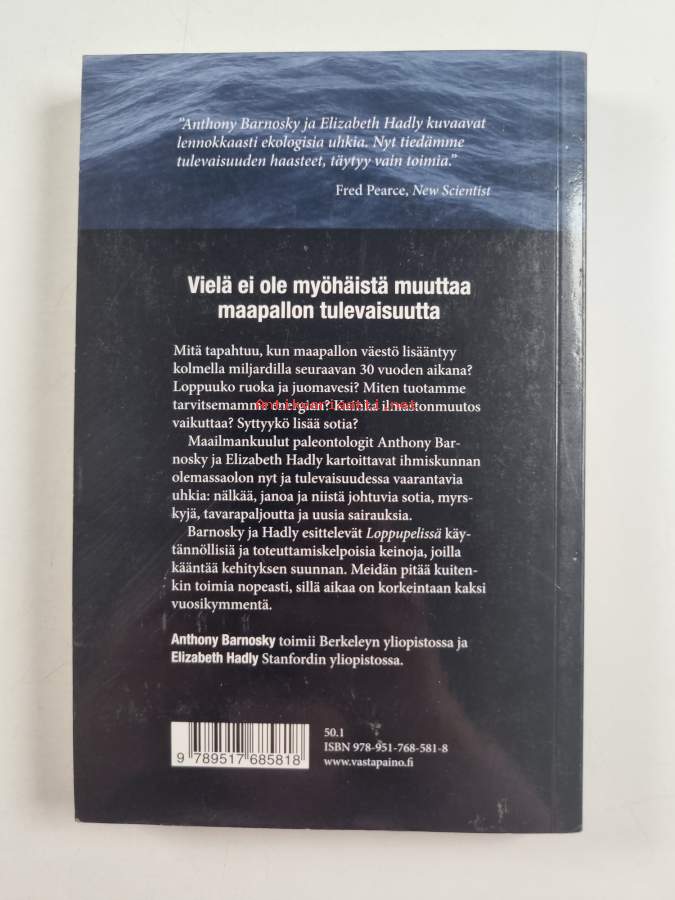 Muu(t) tekijä(t): Tapani Kilpeläinen, Elizabet HadlyAlkuteos: End game : tipping point for planet earthAsiasanat: historia, ennusteet, ympäristönsuojelu, maapallo, ihmiskunta, luonnonsuojelu, tulevaisuus, luonnonvarat, ympäristönmuutokset, väestönkehitys