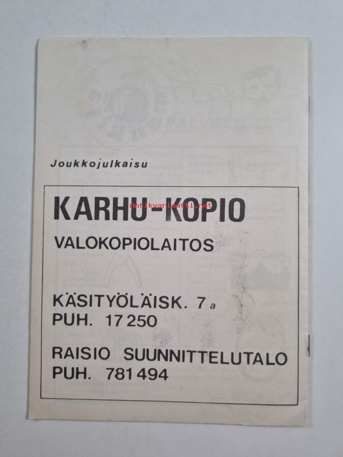 Hyvä. Tarkempi kuntoluokka: K3+ ; Hieman käytön jälkeä kansissa, selkämyksessä aavistus vinoutta