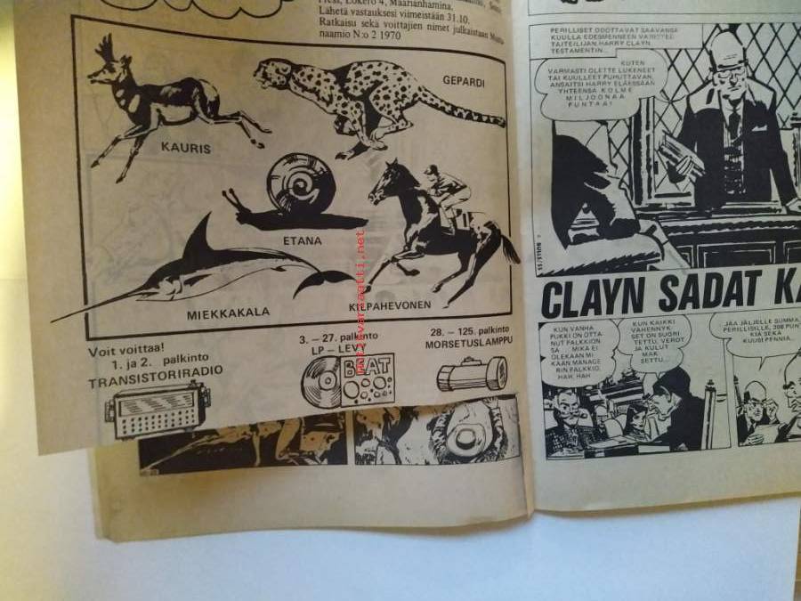 Tyydyttävä. K2->K3 Kansissa kulumia, kilpailukuponki leikattu pois: kts kuva. Muuten ehjä lehti, mustavalkoinen sarjakuva