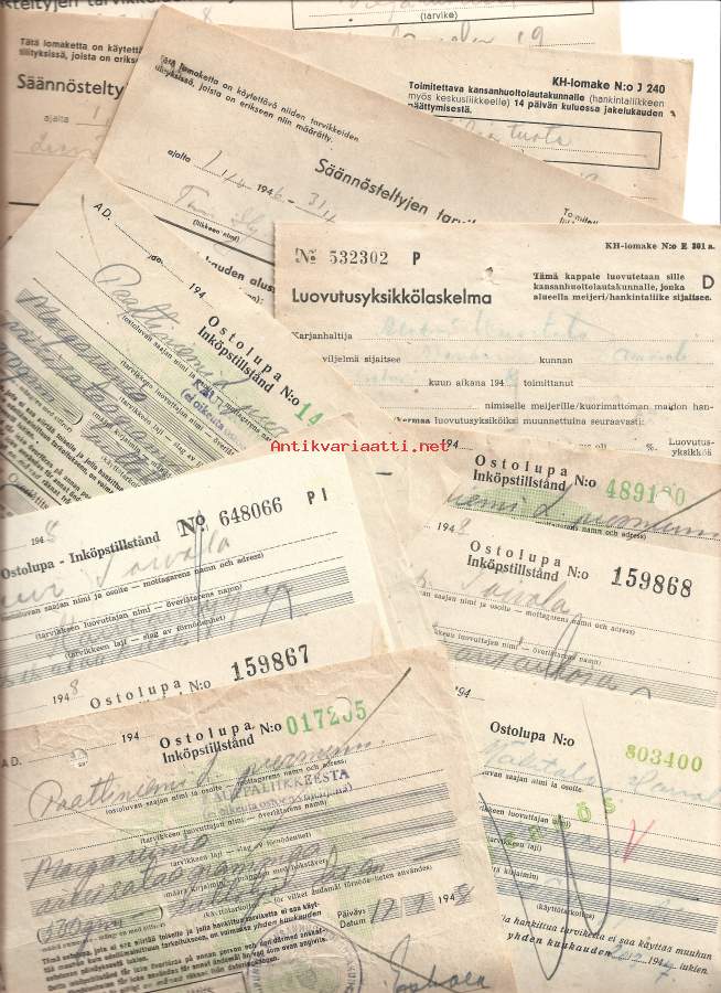 Säännösteltyjen tarvikkeiden tilitys / KH ( Kansanhuolto ) parta- ja hienosaippua - erä n 10 kpl täytettyjä lomakkeita