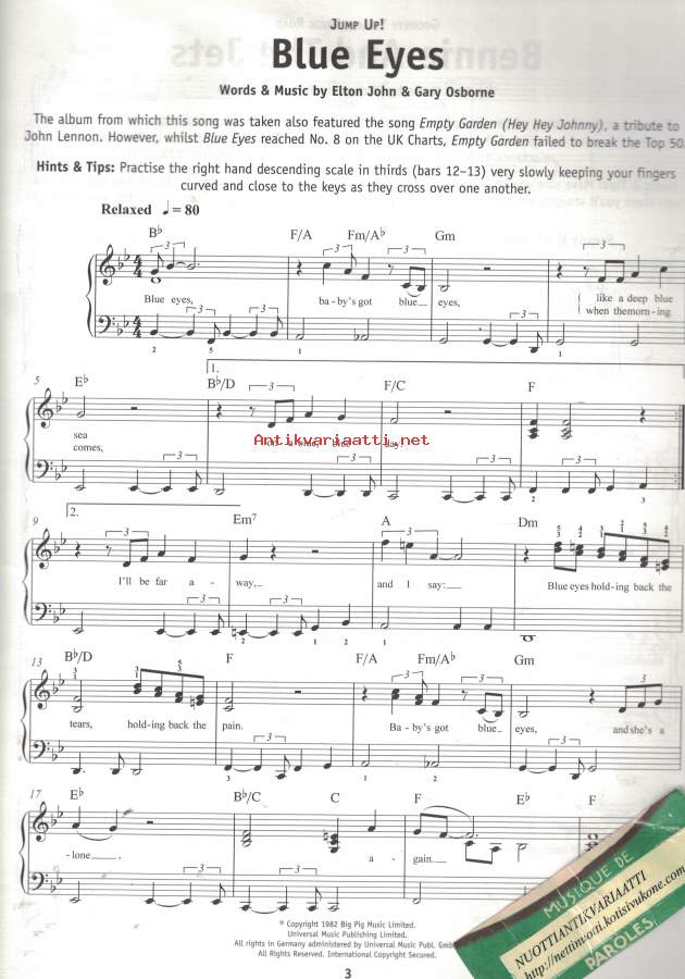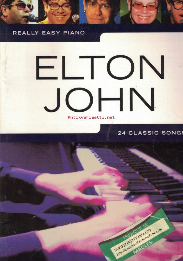 Really easy piano: Bennie and the JetsBlue eyesCan you feel the love tonightCandle in the windCrocodile rockDanielDon't go breaking my heartDon't let the sun go down on meElectricityGoodbye yellow brick roadI guess that's why they call it the bluesI want loveI'm still standingNikitaThe onePassengersRocket man (I think it's gonna be a long long time)SacrificeSad songs (say so much)Saturday night's alright for fightingSomething about the way you look tonightSorry seems to be the hardest wordTiny dancerYour song-Suuri Helposti kuori