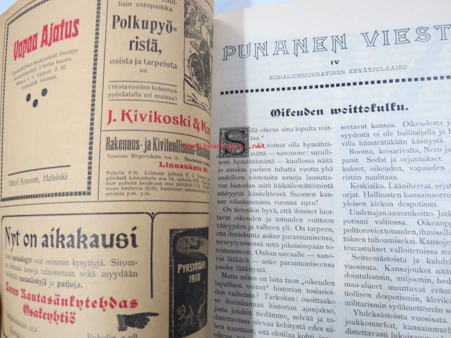 Punanen Viesti (Punainen wiesti) 1910 - Sosialidemokraattinen kevätjulkaisu, propagandistinen, osin tosipohjaista tekstiä, osin kaunokirjallista, kuvitusta