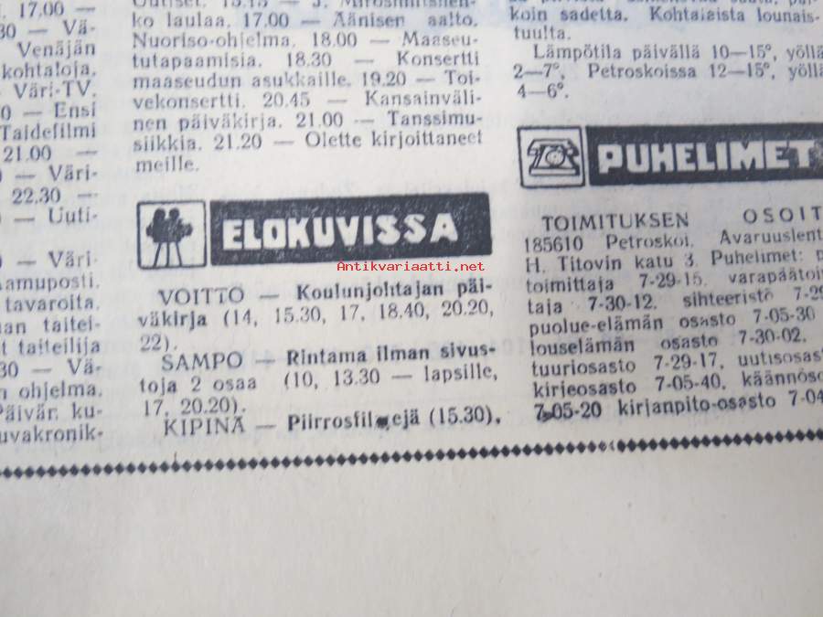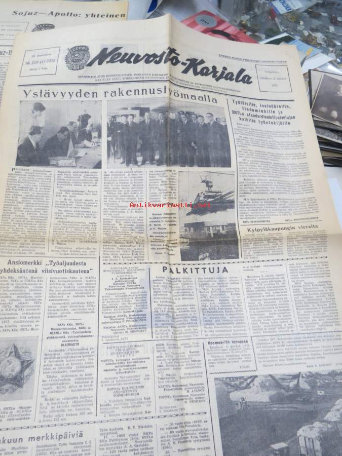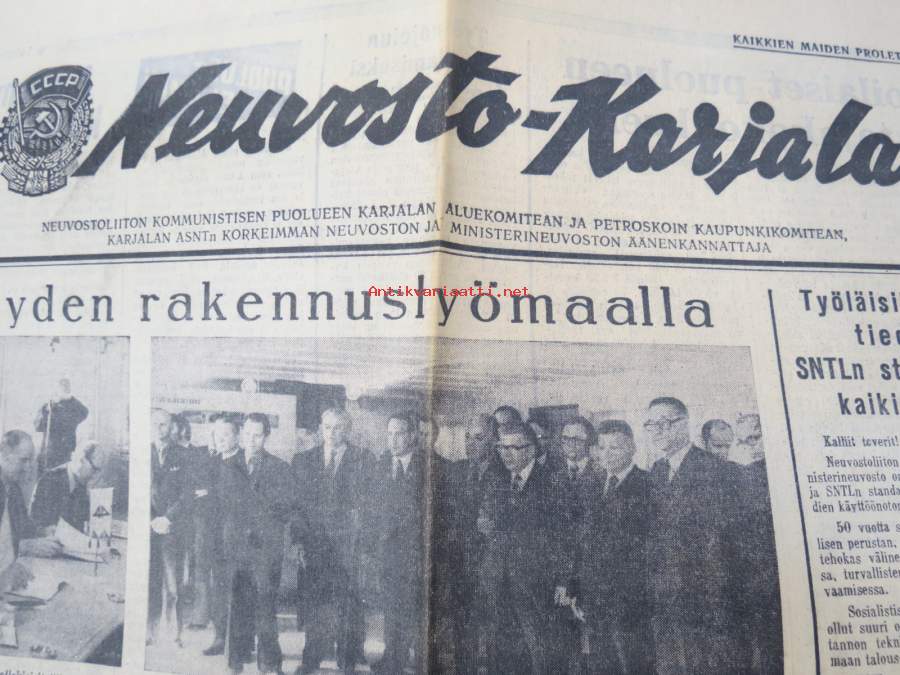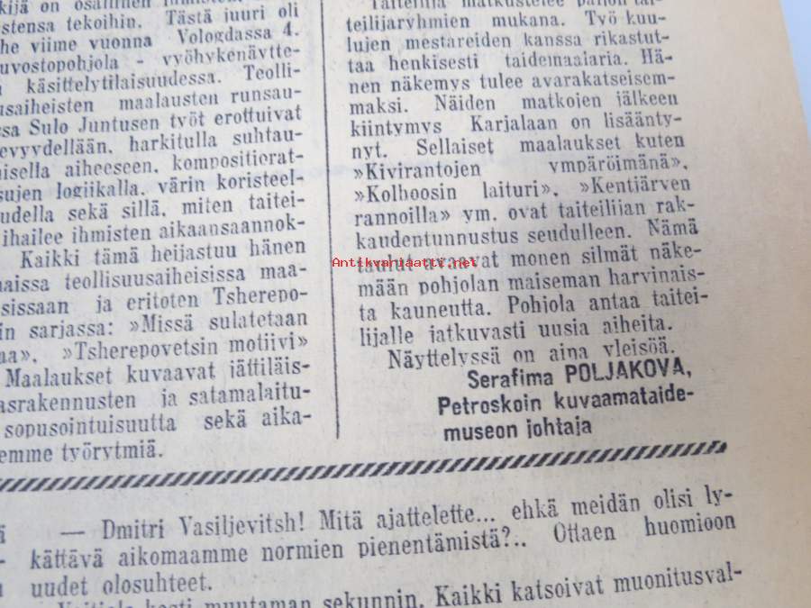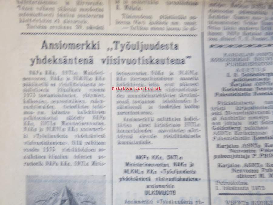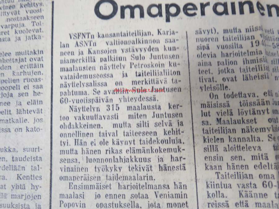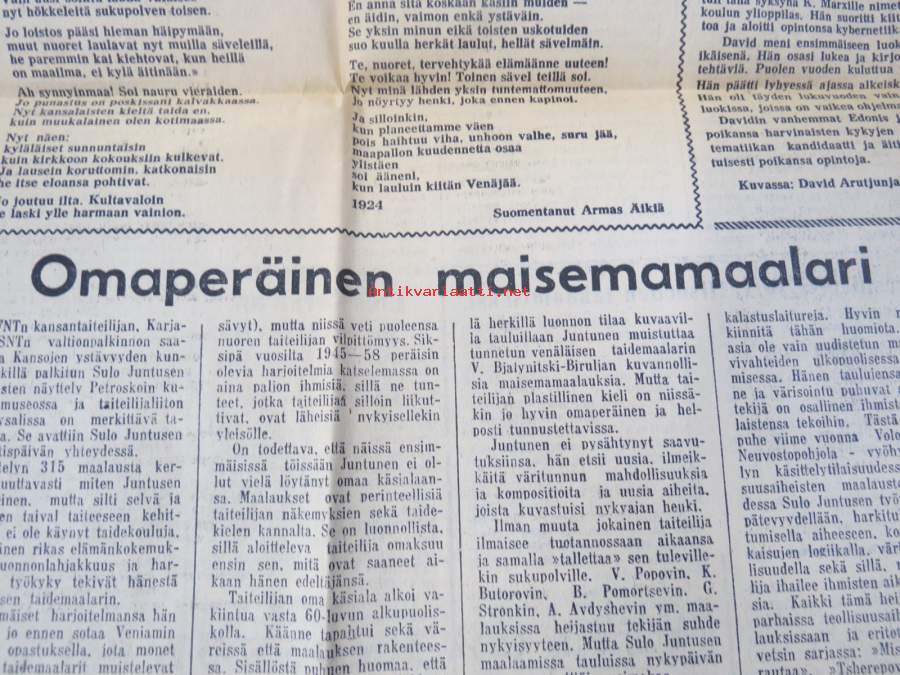 Neuvosto-Karjala, 3.10.1975 (ilmestynyt Petroskoissa); Pääjärvi - ystävyyden rakennustyömaa, Ansiomerkki "Työuljuudesta", Sulo Jjuntunen - omaperäinen maisemamaalari