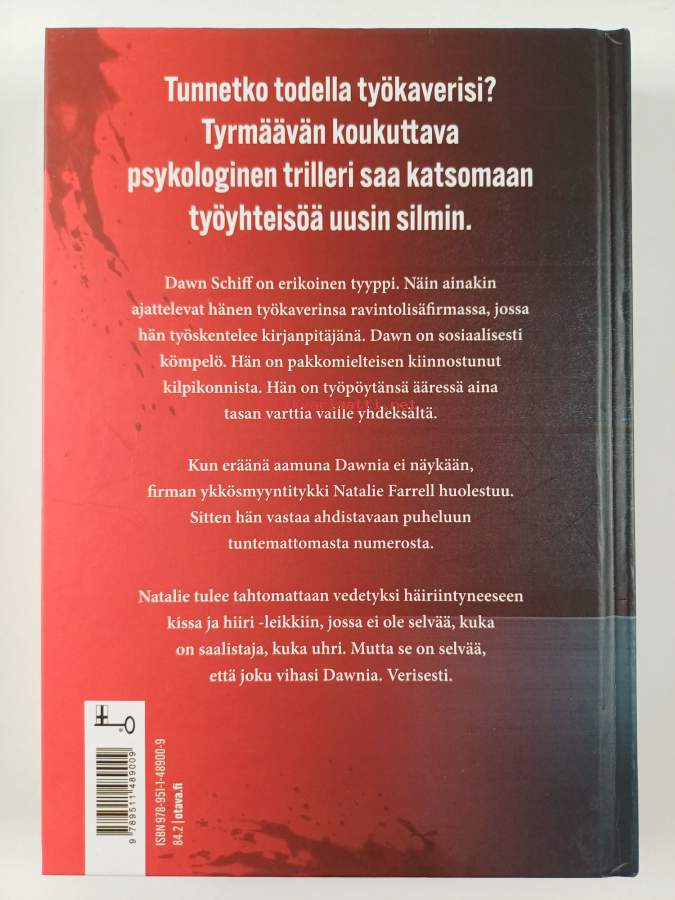 Alkuteos: The CoworkerAsiasanat: kaunokirjallisuus, työpaikat, rikoskirjallisuus, jännityskirjallisuus, työtoverit, valheet, salaisuudet, psykologiset romaanit, työtoveruus