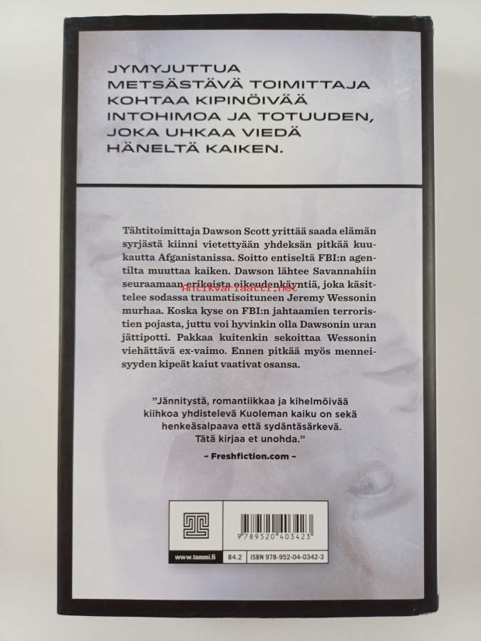 Hyvä. Hieman kulumaa kansissa, pienoista kolhua kansissa, selkämyksessä aavistus vinoutta. Kansipaperin kunto: pientä kulumaa