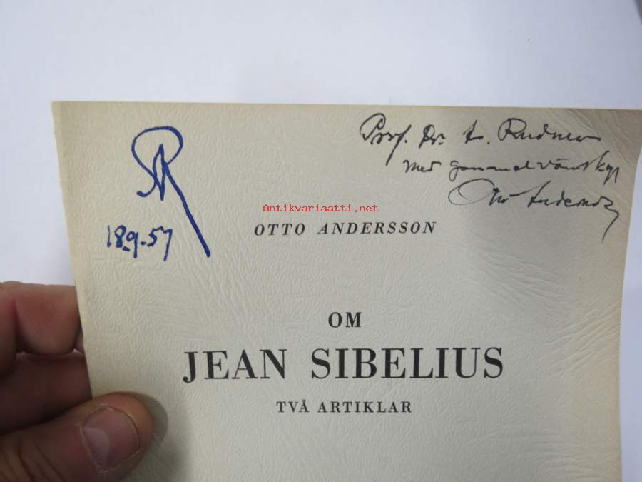 Otto Andersson - Om Jean Sibelius - Två artiklar, Särtryck ur Hbl 8.12.1956 / 3..1957 -tekijän omiste & nimikirjoitus "Till Prof. Dr. Rudner..."