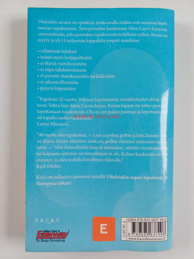 Muu(t) tekijä(t): Helinä KangasMerkinnät: omistajamerkintäAlkuteos: Allen Carr's easy way to stop smokingAsiasanat: tupakointi