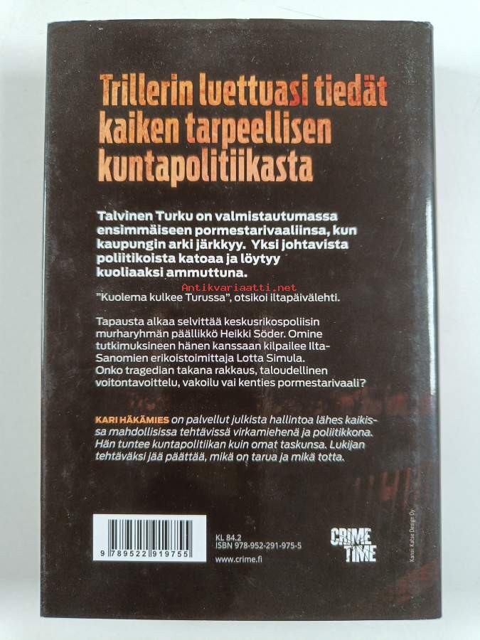 Hyvä. Tarkempi kuntoluokka: K3+ ; Hieman tahraisuutta kansissa, selkämyksessä hieman vinoutta. Kansipaperin kunto: pienoista käytön jälkeä