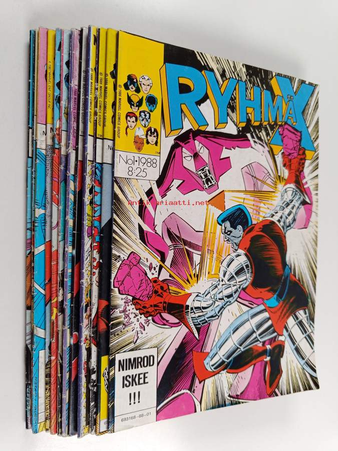 Ryhmä-X vuosikerta 1988 n:ot 1-12 yksittäisnumeroina, n:o 3 toinen niitti irronnut, n:o 6 etukannessa hieman muita lehtiä enemmän tahraisuutta ja reunassa pienoista repemää, n:o 8 etukannen sisäpuolta sotkettu lyijykynällä ja ensimmäisen sivun alareunassa lyijykynämerkintä, n:o 9 takakannen sisäpuolella olevaa Marvel-kilpailulomaketta täytetty ja töhritty, takakanteen tullut kynänpainaumaa
