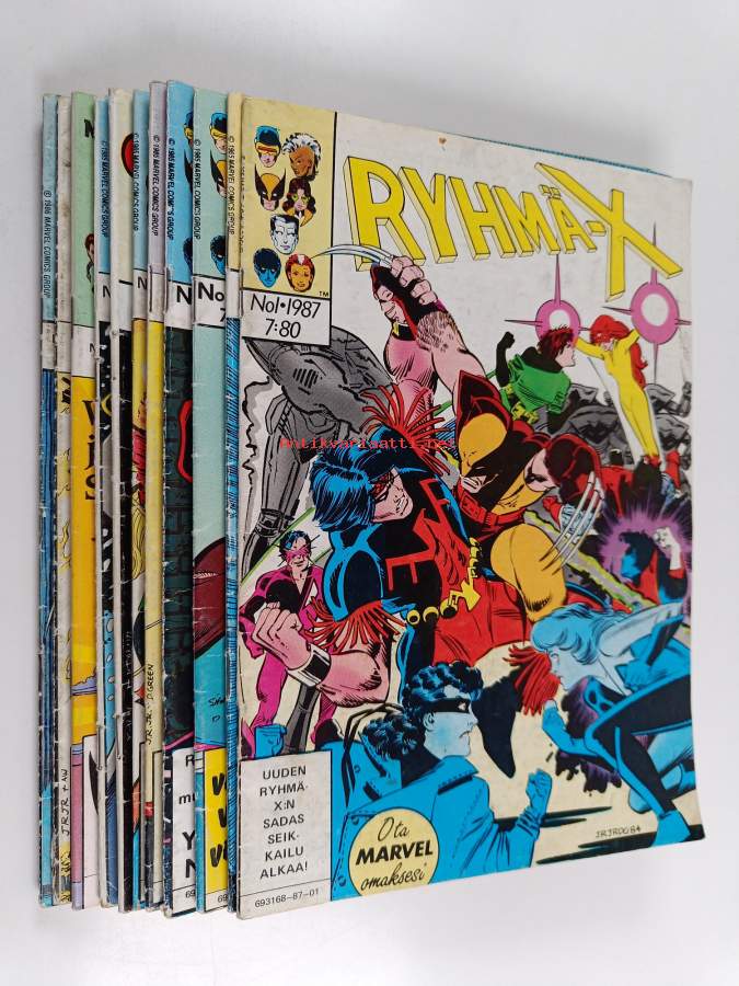 Ryhmä-X vuosikerta 1987 n:ot 1-12 yksittäisnumeroina, muutaman lehden takakannessa vanha osoitetarra, n:o 1 muutamalla viimeisellä sivulla hiukan läikkää alaosassa, n:o 4 takakannesta leikattu pois n. puolet, tämän yksittäisen lehden kuntoluokka on K2, n:o 5 pienoista repeämää takakannen ja loppupuolen sivujen reunassa, n:o 8 takakannen tilaajakuponkia täytelty ja lehden toinen niitti on irronnut, n:o 9 takakannen sisäpuolella kaksi tussilla tehtyä alleviivausta, n:o 11 etukannessa ja ensimmäisen sivun yläreunassa omistajamerkinnät ja selkämyksen alaosassa hiukan repeämää, n:o 12 etukannessa omistajamerkintä
