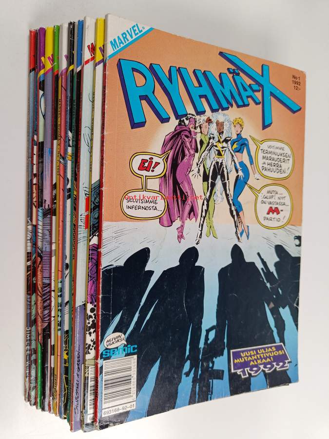 Hyvä. Tarkempi kuntoluokka: K3- ; Pientä kulumaa, pienoista tahraisuutta, pienoista repeämää. Ryhmä-X vuosikerta 1992 n:ot 1-12 yksittäisnumeroina, takakansissa osoitetarra