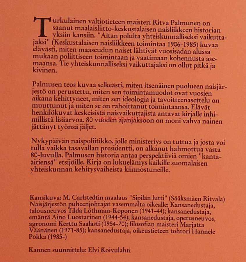 Historiikki kuvaa Maalaisliiton ja Keskustapuolueen naisjärjestöjen toimintaa ja kehitystä aikavälillä 1906 - 1985. Teos Käsittelee ennen kaikkea naisten poliittista osallistumista, järjestötyötä ja yhteiskunnallista vaikuttamista maaseudun ja keskustalaisen liikkeen näkökulmasta. Kuvitettu. Dimensiot 25 ¤ 18 cm.