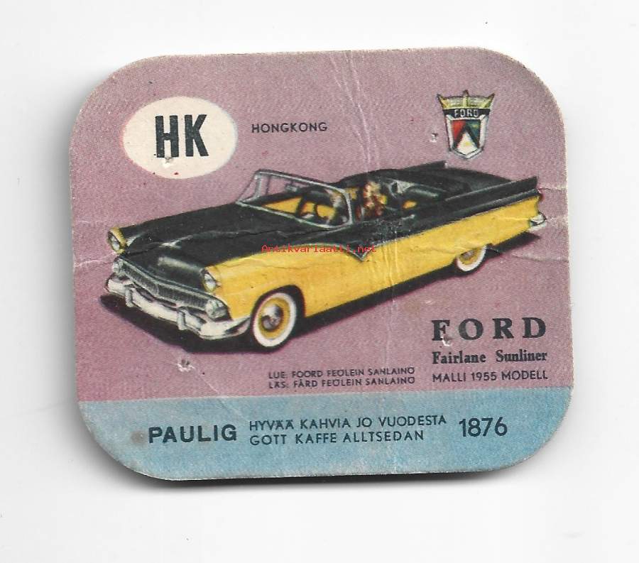 Ford Fairlane m 1955 - autokortti, keräilykuva, kahvipakettikuva - uusintapainos / Vuonna 2014 Pauligin Juhla Mokka täytti 85 v ja julkaisi suosituista