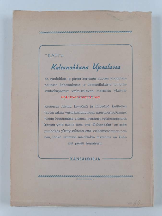 Hyvä. Tarkempi kuntoluokka: K3- ; Hieman nuhruisuutta, kansien reunoilla taittumaa ja rispaantumaa (koska ohuehkot kannet sivuja leveämmät), sivut vielä osittain leikkaamatta auki eli osittain lukematon kirja