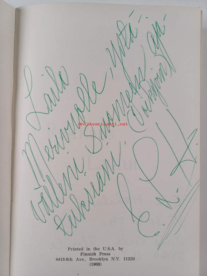 Hyvä. Tarkempi kuntoluokka: K3- ; Hieman kulumaa kansissa, pienoista tahraisuutta kansissa, muutamalla sivulla merkintää, sidos hieman näkyvissä yhdellä aukeamalla