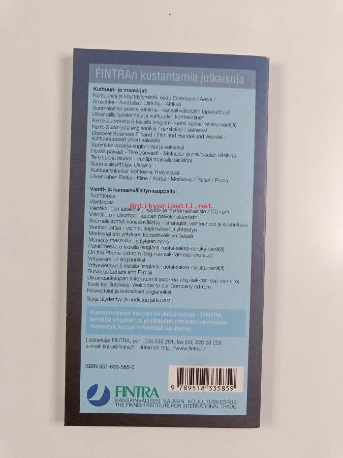 Sarja: Fintra-julkaisu nro 77CAsiasanat: käyttäytyminen, liike-elämä, kansainvälistyminen, käytösoppaat, tavat, liiketalous, tapakulttuuri, kulttuuri, kansainvälinen kauppa, kulttuuriympäristö, yhteiskunta, maantiede, kulttuurierot, ulkomaanmatkailu, kauppatavat, liikematkat, kansainvälisyys, tavat (tapakulttuuri), beteende, affärsliv, kultur, internationalism, samhället, kulturskillnader, seder och bruk, seder, geografi (vetenskaper), etiketthandböcker, kulturmiljö, internationalisering, handelsbruk, företagsekonomi (ekonomi), utlandsresor, internationell handel, affärsresor