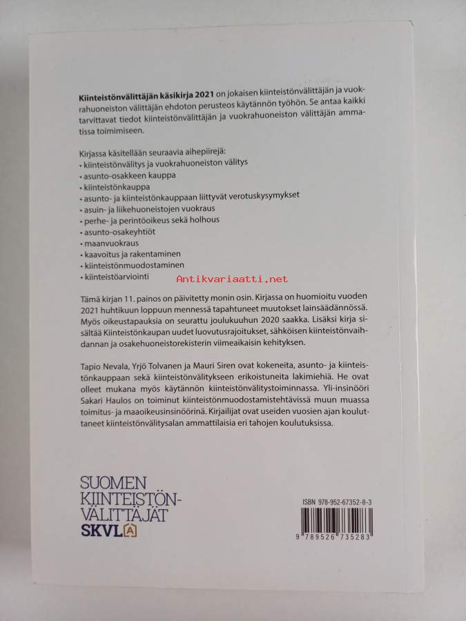 Muu(t) tekijä(t): Yrjö Tolvanen, Mauri Sirén ym.Asiasanat: rakentaminen, lainsäädäntö, verotus, perintöoikeus, perheoikeus, asunto-osakeyhtiöt, asuntokauppa, kiinteistönvälitys, kaavoitus, huoneenvuokra, asunto-osakeyhtiölaki, kiinteistökauppa, kiinteistönmuodostamisoikeus, maanvuokra, asunnonvälitys, oikeustoimikelpoisuus, kiinteistöarviointi