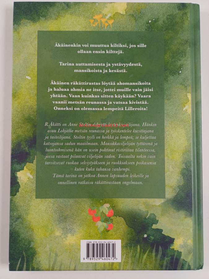 Asiasanat: luonto, sadut, lastenkirjallisuus, linnut, metsät, auttaminen, vaaratilanteet, kuvakirjat, ahneus, ystävällisyys, kiukku, ahomansikat, mansikkasato, metsämansikat, metsänantimet, nälkäkiukku, räkättirastas, äksyily