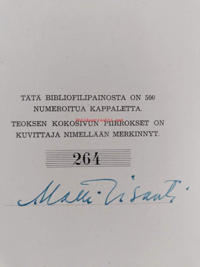 Hyvä. Hieman kulumaa kansissa, pienoista kolhua selkämyksen päissä, pienoista nuhruisuutta kansissa. no. 264/500, kuvittajan signeeraama
