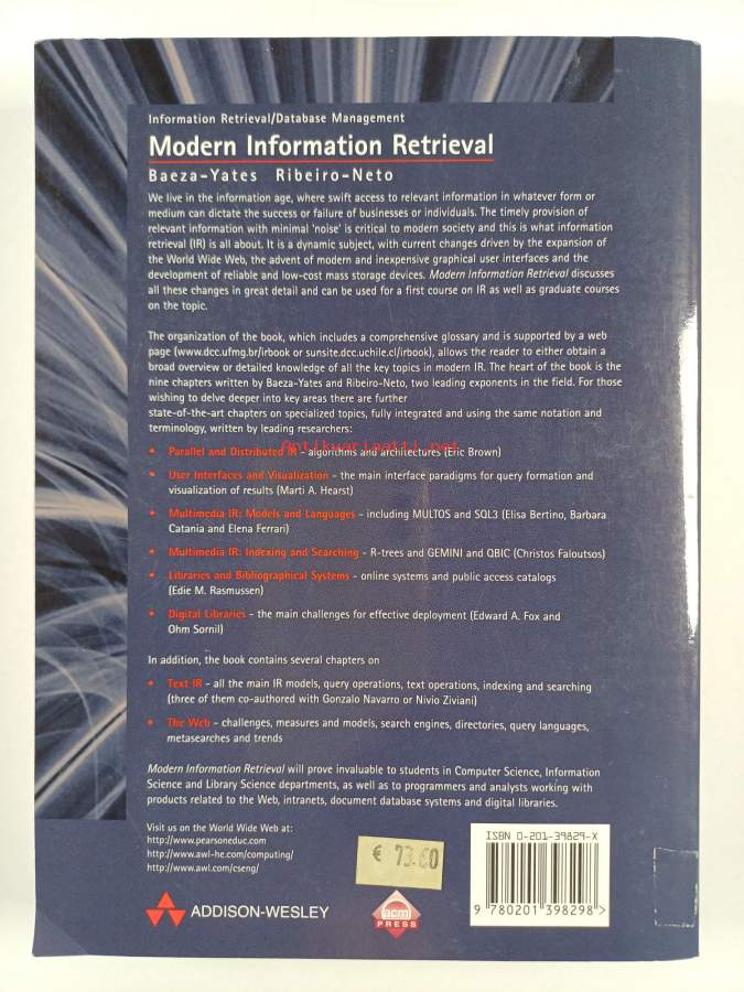 Muu(t) tekijä(t): Berthier Ribeiro-NetoMerkinnät: omistajamerkintä (leima)Sarja: ACM Press BooksAsiasanat: tietotekniikka, kehittäminen, kirjastot, multimedia, tietokannat, tietojärjestelmät, tiedonhaku, tiedonhakujärjestelmät, databaser, utveckling (verksamhet), bibliotek, informationsteknik, informationssökning, informationssökningssystem, digitaaliset kirjastot, digitala bibliotek, informationssystem (tekniska system)