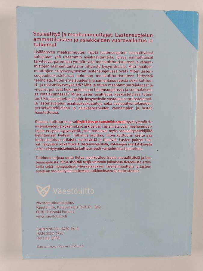 Merkinnät: ylivedetty omistajamerkintäSarja: Väestöntutkimuslaitoksen julkaisusarja. D 47Asiasanat: lastensuojelu, sosiaalityö, vuorovaikutus, maahanmuuttajat, monikulttuurisuus, vähemmistöt, rasismi, sosiaalityöntekijät