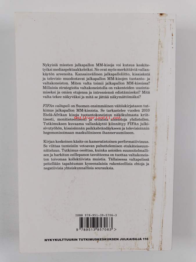 Sarja: Nykykulttuurin tutkimuskeskuksen julkaisuja 116Asiasanat: jalkapallo, maailmanmestaruuskisat, urheilujärjestöt, väitöskirjat, maskuliinisuus, vallankäyttö, media, kansainväliset järjestöt, julkisuuskuva, brändäys, televisiointi, spektaakkelit