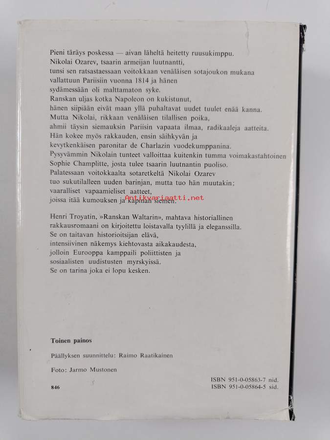 Hyvä. Hieman kulumaa kansissa, selkämyksessä vinoutta. Kansipaperin kunto: repeämiä/kulumaa