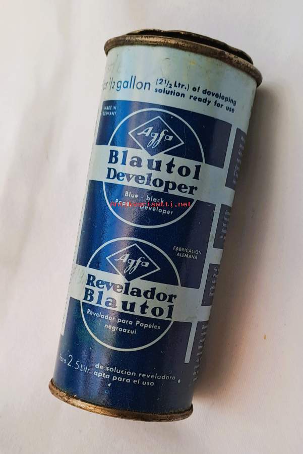 Agfa Blautol Entwickler - 2- osainen tyhjä tuotepakkaus peltiä 13x5 cm