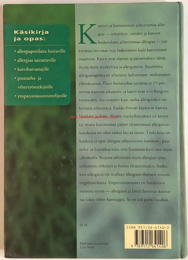 Käsikirja ja opas allergiapotilaita hoitaville, allergiaa sairastaville, kasviharrastajille ym.Arvostelukappale.Kuvitettu.Dimensiot: 25X18CM