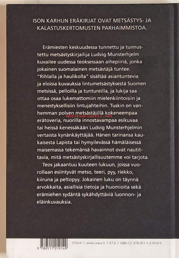Eloisia kuvauksia lintumetsästyksestä Suomessa.Dimensiot: 22x15cm